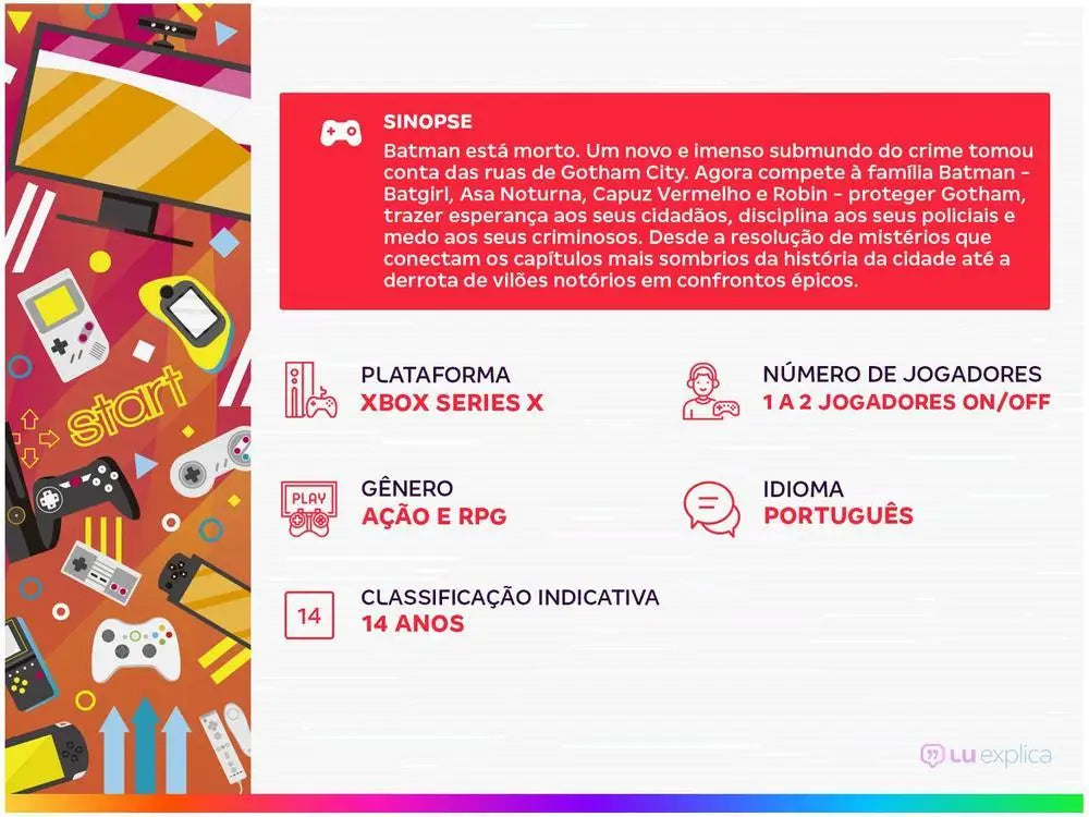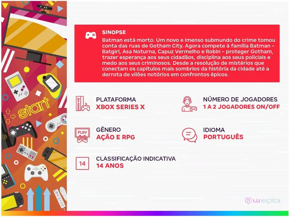 Batman está morto. Um novo e imenso submundo do crime tomou conta das ruas de Gotham City. Agora compete à família Batman - Batgirl, Asa Noturna, Capuz Vermelho e Robin - proteger Gotham, trazer esperança aos seus cidadãos, disciplina aos seus policiais e medo aos seus criminosos. Desde a resolução de mistérios que conectam os capítulos mais sombrios da história da cidade até a derrota de vilões notórios em confrontos épicos. O jogo Gotham Knights é um RPG de ação de mundo aberto, ambientado na Gotham City mais dinâmica e interativa de todos os tempos. Patrulhe os cinco distritos distintos de Gotham em modo solo ou co-op e interrompa atividades criminosas onde quer que as encontre. Seu legado começa agora. Torne-se um cavaleiro. História original repleta de ação ambientada no universo Batman da DC – com o Campanário como base de operações, esta nova era de heróis resolverá mistérios que conectam os capítulos mais sombrios da história de Gotham - de suas torres altas para sua rede criminosa subterrânea. Embarque em histórias ricas, incluindo confrontos contra alguns dos mais infames super-vilões da DC como Mr. Freeze, que está determinado a engolir Gotham City no gelo, e a misteriosa Corte das Corujas, uma sociedade secreta composta pelas famílias mais ricas de Gotham City. Explore e lute contra o crime no mundo aberto em Gotham City – Patrulhe as ruas escuras de cinco bairros distintos em uma Gotham dinâmica e interativa usando uma variedade de habilidades de travessia e movimentos de combate heróicos, bem como a icônica Batmoto. De combate ao crime nas ruas a confrontos com os icônicos Super-Vilões da DC, salve a cidade do caos. Habilidades e Personalização Únicas dos Personagens – Cada herói tem habilidades, equipamentos, armas e um traje personalizável únicos. Batgirl empunha sua tonfa corpo a corpo; Asa Noturna usa seus bastões de esgrima duplos; O Capuz Vermelho treinou para atingir o pico da força humana; e Robin é habilmente habilidoso com seu cajado desmontável. Aproveite este lançamento da Warner Bros Games para Xbox Series X que acompanha 4 cards feitos por Ivan Reis.